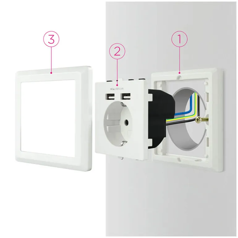 Base de enchufe de pared tipo schuko con 2 tomas USB. Producto apto para instalar en cajetín universal mediante tornillos.