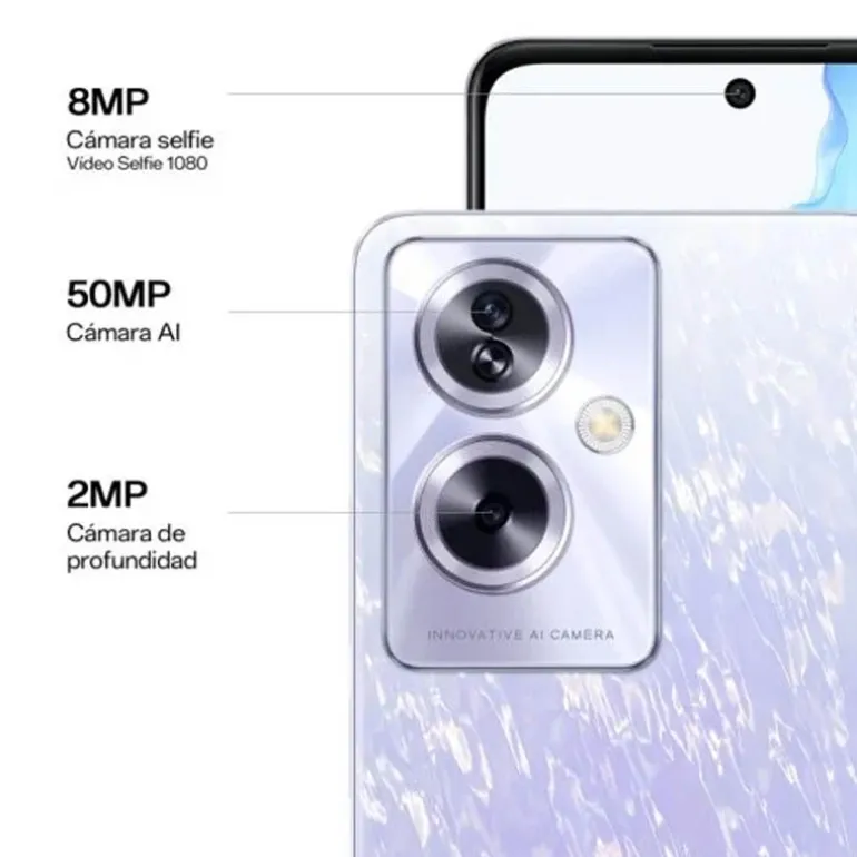 Cámara principal de 50 MP; f/1,8; FOV: 77°; lentes 5P; compatible con enfoque automático y usa un motor de ciclo abierto