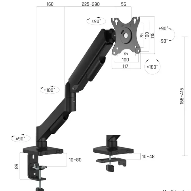 El soporte permite regular la altura del monitor entre 165 mm y 415 mm, adecuando la posición del centro de la pantalla a la línea de los ojos. La extensión máxima del brazo, de 506 mm, ofrece un alcance generoso para acercar o alejar la pantalla según la profundidad de la mesa o las preferencias del usuario.