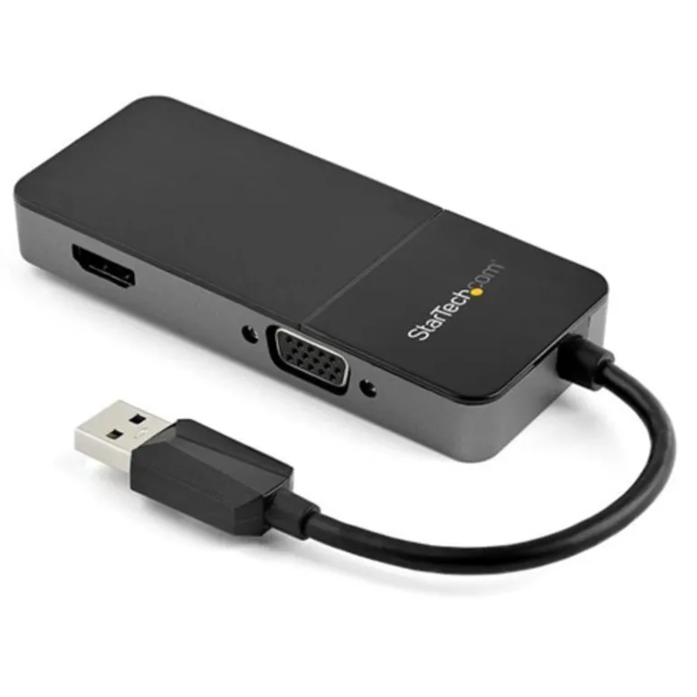 Este adaptador USB 3.0 a HDMI VGA constituye una solución portátil para la conexión de una pantalla HDMI y VGA a su ordenador portátil o de sobremesa equipado con USB-A. El adaptador de vídeo multipuerto le permite duplicar o extender el contenido en dos monitores adicionales simultáneamente (1x HDMI y 1x VGA), lo cual crea una estación de trabajo de dos pantallas.