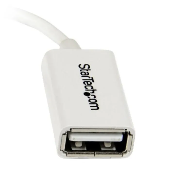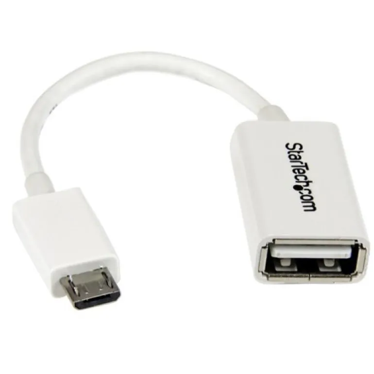 El cable adaptador Micro USB OTG («On-The-Go», portátil), blanco, modelo UUSBOTGW, convierte el puerto Micro USB de un smartphone o una tableta en puerto USB anfitrión que se puede utilizar para conectar un dispositivo periférico USB, como un ratón, un teclado o una memoria USB.