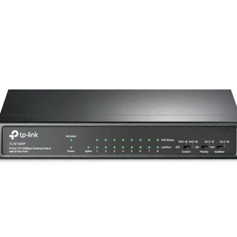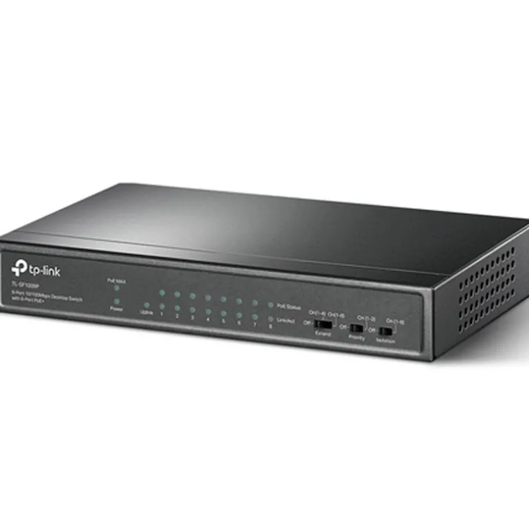 Switch TP-Link TL-SF1009P de sobremesa con 9 puertos 10/100 Mbps, incluyendo 8 puertos PoE+ que suministran energía y datos simultáneamente. Diseñado para redes pequeñas que requieren alimentación integrada para dispositivos como cámaras y puntos de acceso. Fácil instalación plug-and-play y gestión eficiente de energía.