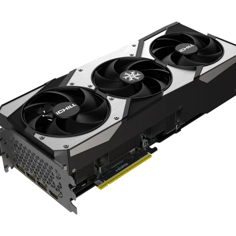 El sistema de enfriamiento iCHILL X3 cuenta con tres ventiladores de alta eficiencia que optimizan el flujo de aire a través del disipador térmico de gran tamaño. Las aletas y el diseño avanzado garantizan que el calor se disipe rápidamente, manteniendo la GPU fresca incluso durante largas sesiones de juego o renderización intensiva.