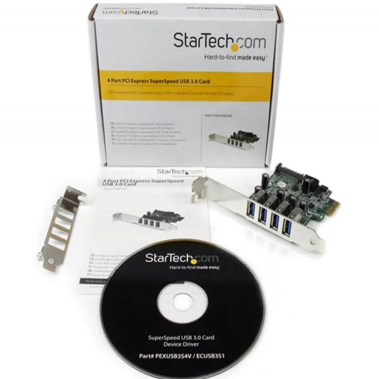 La Tarjeta PCI Express USB 3.0 (con Alimentación SATA), PEXUSB3S4V permite agregar 4 puertos USB 3.0 externos a cualquier sistema equipado con PCI Express. El USB 3.0 SuperSpeed proporciona un ancho de banda de datos de hasta 5 Gbps, y sigue siendo compatible con dispositivos USB 2.0 existentes a 480Mbps.