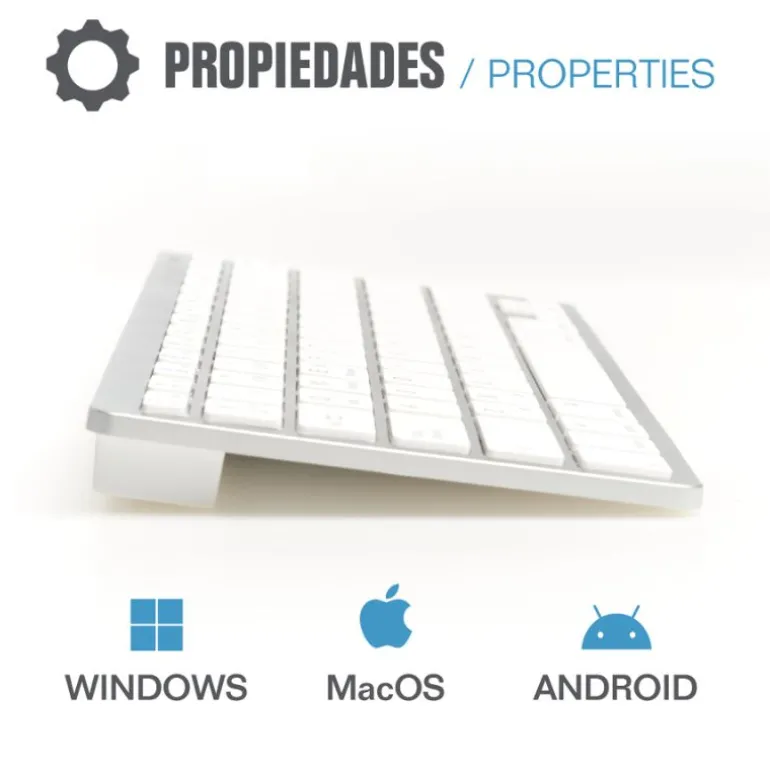 Teclado compacto 60% (78 teclas) sin pad numérico, Bluetooth 3.0 de doble canal para alternar entre dos dispositivos. Diseño delgado y ligero, teclas planas de tacto suave y escritura muy silenciosa. Compatible con Windows, macOS y Android; funciona con 2×AAA.