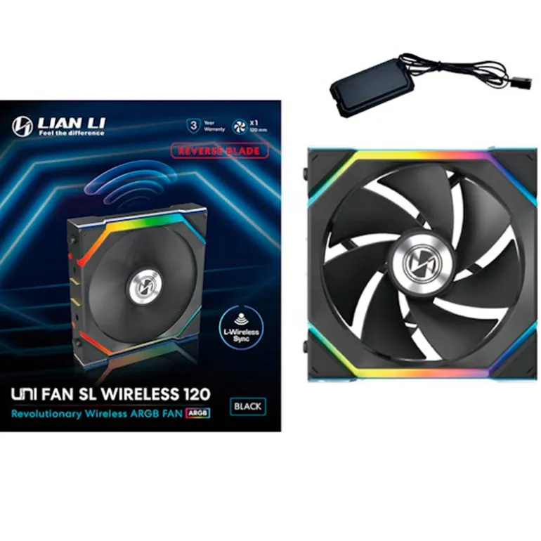 Ventilador Lian Li Uni Fan SL ARGB Reverse Blade 120mm Wireless en color negro. Compatible con sincronización inalámbrica L, sistema UNIFAN para gestión eficiente de cables, con opciones LED y LCD combinables. Control total de velocidad y efectos vía L-Connect 3, optimizado para flujo de aire y bajo ruido.