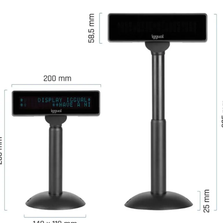 El visor TPV regulable iggual USB VFD de 7″ es la solución perfecta para mostrar información clara al cliente en entornos de punto de venta. Su pantalla fluorescente de vacío con 40 caracteres (20×2 líneas) ofrece una visibilidad excelente gracias a un brillo de hasta 1.000 cd/m². Incluye columna regulable en altura, rotación completa y amplia compatibilidad con comandos estándar del sector (LD220, Epson POS D101, AEDEX, CD5220, entre otros). Con conexión USB-A integrada y diseño robusto, es ideal para comercios, hostelería y negocios que requieren fiabilidad y visualización precisa.