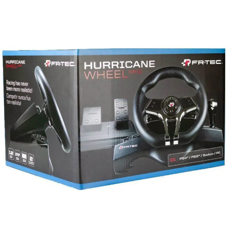 Hurricane MKII, diseñado especialmente para PlayStation 3, PlayStation 4, Nintendo Switch y PC. Dispone de levas y cambio de marchas secuencial para disfrutar de dos modos de conducción. Incluye pedales de freno y aceleración. Sus botones configurables ofrecerán una ventaja adicional para vencer a los oponentes más duros y el efecto de vibración ofrece la mayor inmersión en la carrera.