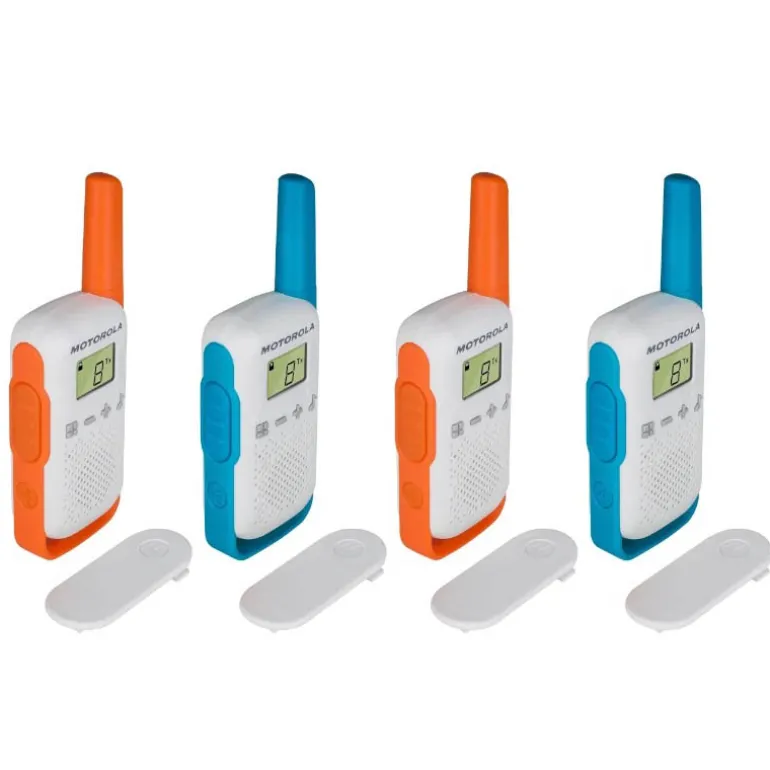 El Walkie Talkie Motorola T42 Quad Pack ofrece comunicación clara y estable con 16 canales y un alcance de hasta 4 km. Ideal para grupos, cuenta con sincronización sencilla, alertas personalizables y es fácil de transportar. Incluye 4 walkie-talkies, clips de cinturón y adhesivos de personalización.