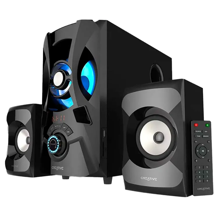 El sistema de altavoces más potente en la serie Creative SBS E2000, este completo sistema de altavoces 2.1 está diseñado para cautivarle con su increíble rendimiento de audio, además de ofrecerle un amplio espectro de opciones de conectividad (con cable, inalámbricas y otras formas).