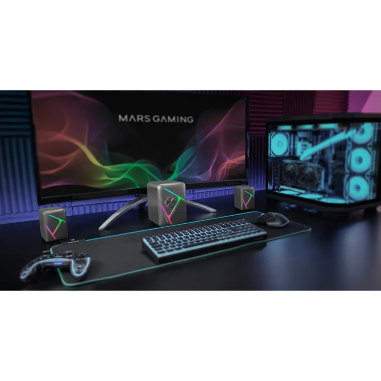 El altavoz gaming para ordenador MS-H21 ofrece una experiencia auditiva inigualable con un potente sistema de sonido 2.1 de 35W y un sistema de drivers invertidos 3D surround. Diseñado para ofrecer una inmersión total, este altavoz es perfecto tanto para música como para juegos y películas, ofreciendo una calidad de sonido excepcional. Con control de volumen frontal, iluminación RGB dinámica y conexión Plug & Play, el MS-H21 combina rendimiento y estilo para transformar tu setup en un centro de entretenimiento completo.