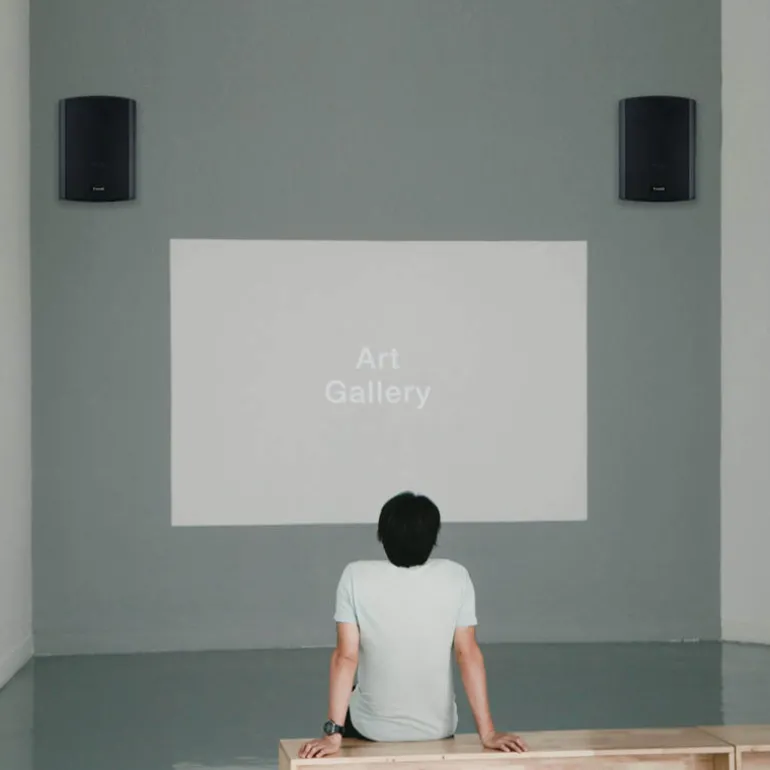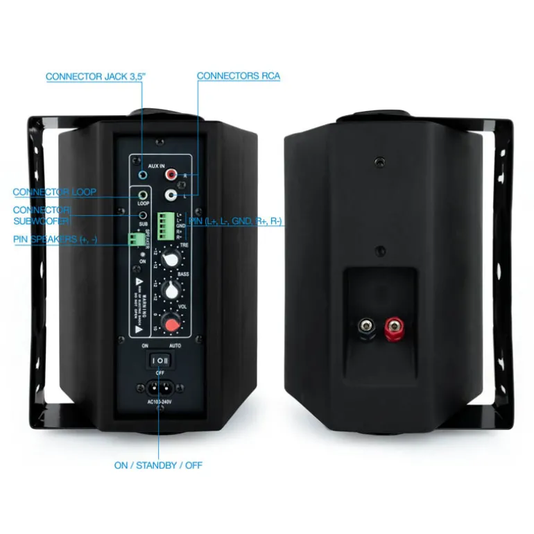 Altavoces Autoamplificados de Pared. Altavoces autoamplificados con soporte de pared metálico. Voltaje de entrada: 110-240V. Potencia de salida RMS: 2x30W.