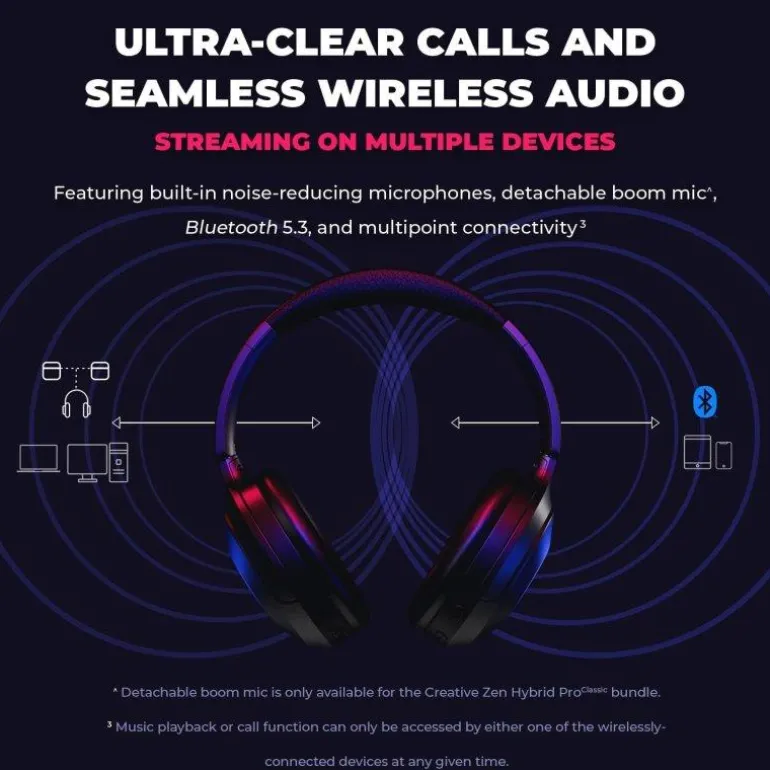 El Creative Zen Hybrid Pro Classic prepara la próxima generación de audio digital con Bluetooth® Audio LE y códec LC3, con audio personalizado e inmersivo con la galardonada tecnología Super X-Fi®. También cuenta con cancelación de ruido activa híbrida (ANC) y modo ambiente, batería de duración ultralarga de hasta 100 horas y modo de latencia ultrabaja (ULL), lo que libera una nueva dimensión de disfrute de audio como ninguna otra.