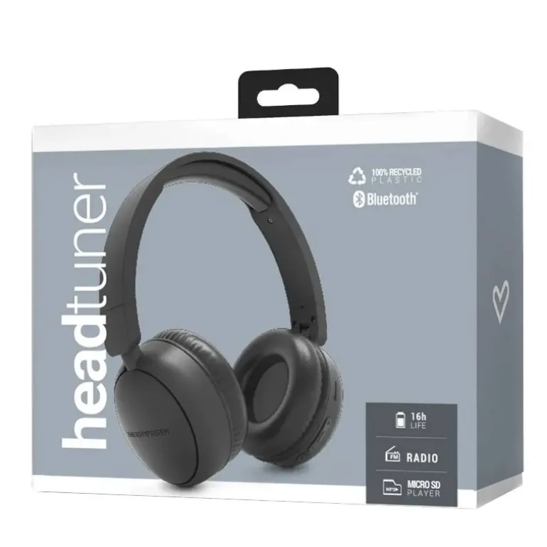 Auriculares inalámbricos de diadema fabricados con plástico 100% reciclado, con certificación GRS. Los materiales utilizados en el packaging son también sostenibles y respetuosos con el medio ambiente (certificación FSC). ¡Di hola a música sostenible!