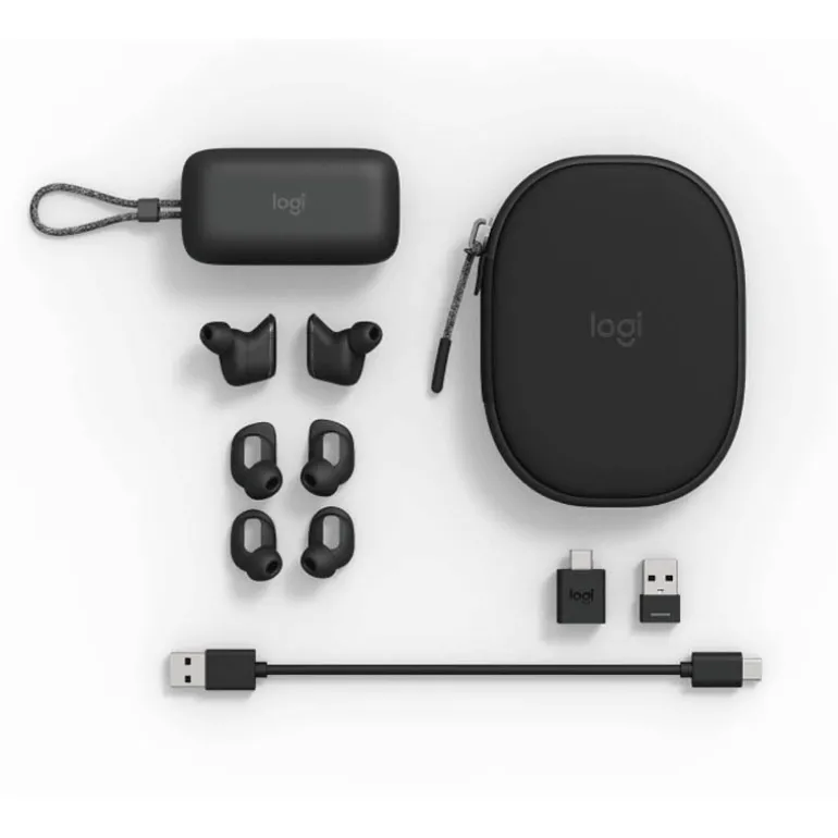 - Duración de batería de auriculares (tiempo en escucha): Hasta 6 h (ANC activada), hasta 10 h (ANC desactivada) 4La duración de la batería se ha medido a partir de una carga completa hasta el apagado automático, utilizando un nivel de volumen del 50 %, tanto para tiempo de conversación como de escucha con detección interna desactivada. Desactive ANC en Logi Tune si es necesario.
