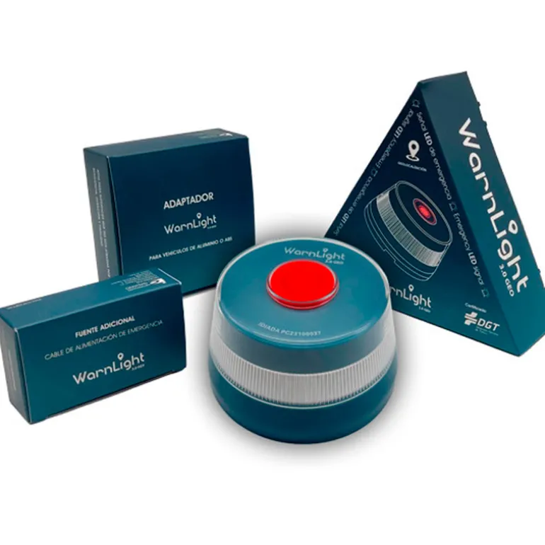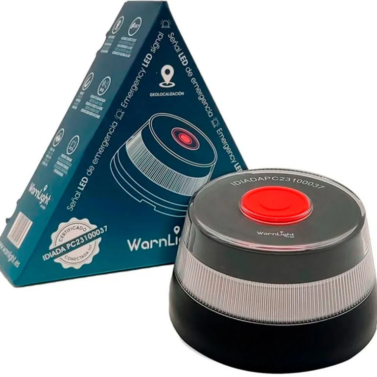 La luz de emergencia V16 de WarnLight 3.0 GEO está certificada por la DGT y conectada con Telefónica Tech. Esta baliza está diseñada para cumplir con la normativa de seguridad vial de uso obligatorio a partir del 1 de enero de 2026, garantizando máxima visibilidad y protección en carreteras.