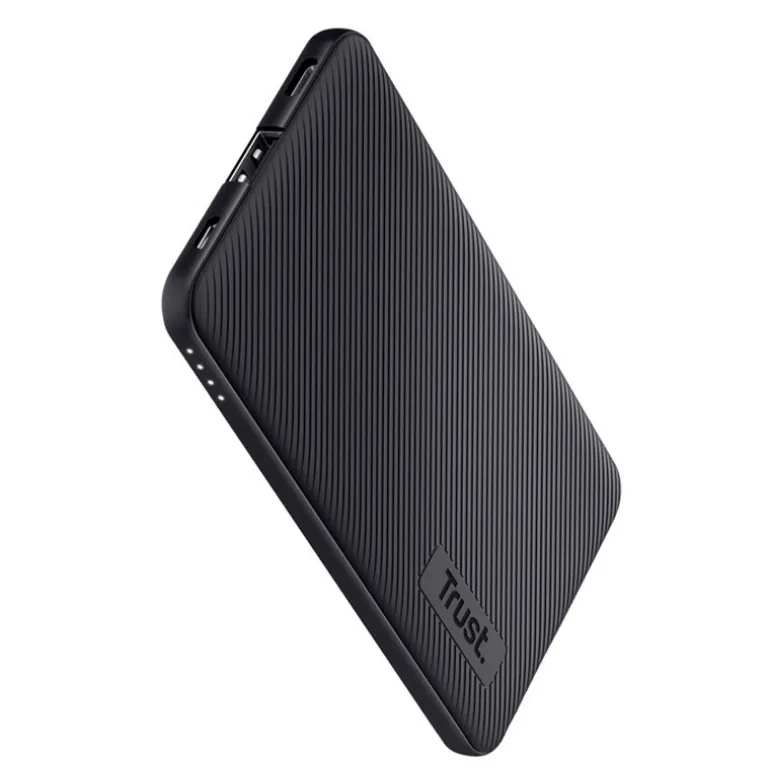 Powerbank ultrafino Trust Primo de 5.000 mAh en color negro. Ofrece una carga rápida de hasta 15W para mantener tus dispositivos siempre listos, ideal para usar sobre la marcha gracias a su diseño compacto y portátil.