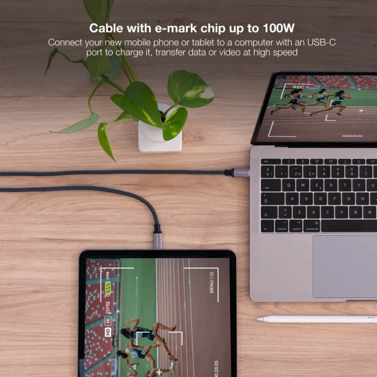 El cable ofrece hasta 5 amperios 100W de carga y lleva E-mark chip, con lo cual se puede usar para cargar su dispositivo móvil, tablet, portátil de hasta 100W etc.