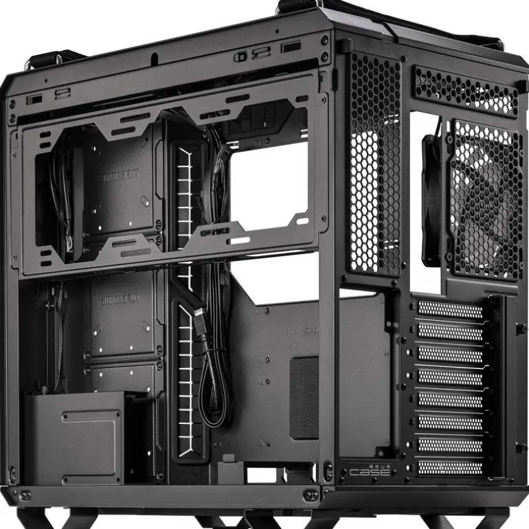 El TUF Gaming GT502 PLUS continúa sus optimizaciones para los constructores con paneles laterales que se pueden quitar simplemente presionando un botón oculto en la parte trasera del chasis.
