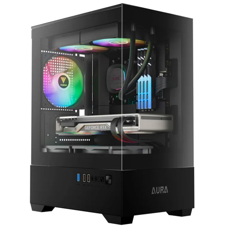 La serie AURA GC9M ARGB, disponible en blanco y negro, ofrece un diseño panorámico compacto con tres ventiladores ARGB integrados, compatibilidad mejorada y paneles frontales y laterales de cristal templado para realzar la estética de su equipo.
