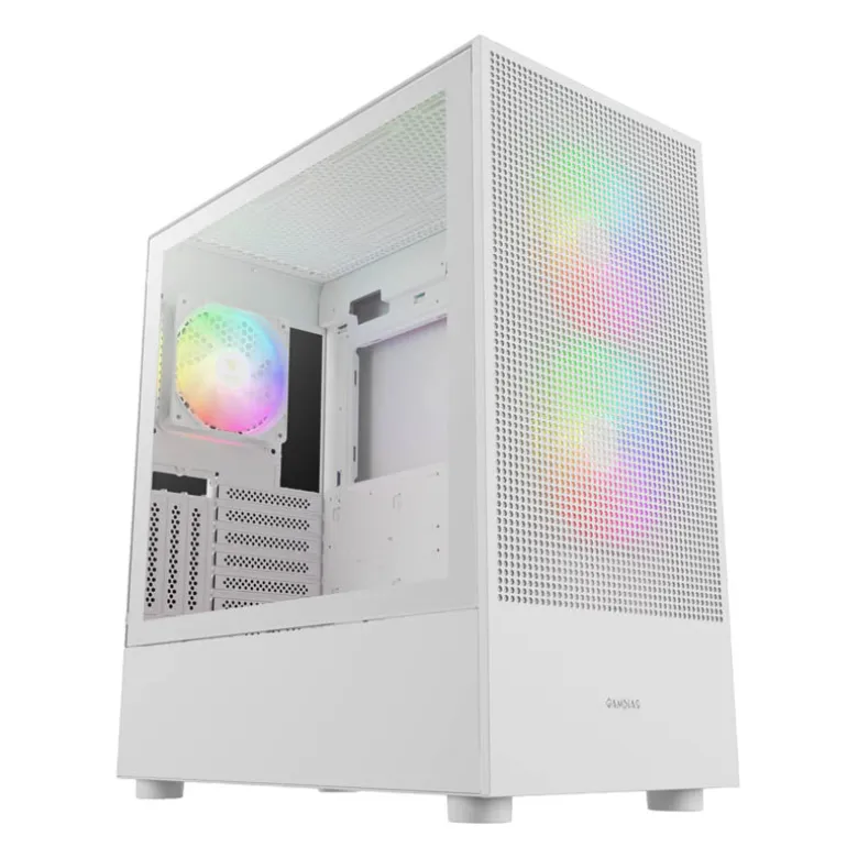 La serie TALOS E3 MESH ELITE presenta una estética en blanco nieve, centrada en maximizar la compatibilidad y el rendimiento del flujo de aire. Equipado con dos ventiladores ARGB PWM de 140 mm y uno de 120 mm en la parte trasera, junto con un panel frontal de malla perforada, proporciona un aspecto elegante con una cubierta de PSU destacada y un panel lateral de vidrio templado.