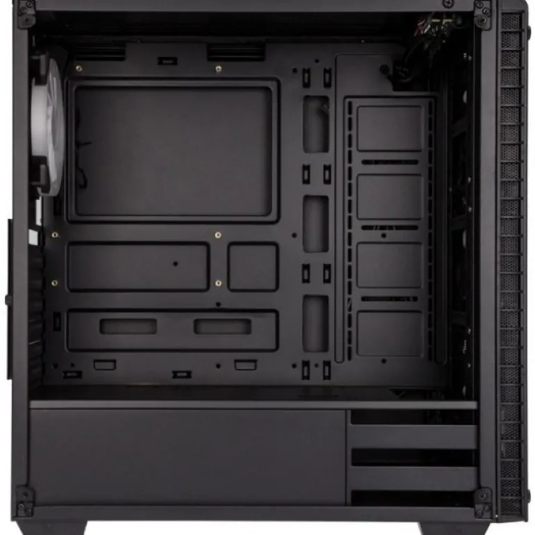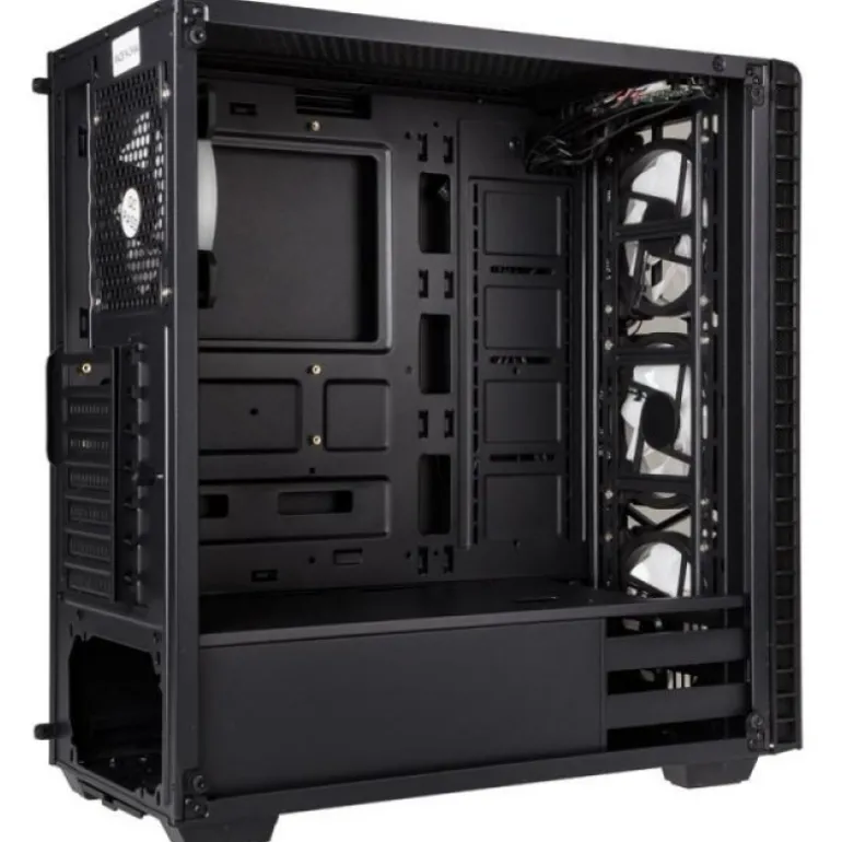 El robusto chasis consiste en un acero SECC fuerte de un milímetro y está equipado con un panel lateral y de vidrio templado de cuatro milímetros de grosor . El interior interior tiene un revestimiento negro y también está equipado con una cubierta para la fuente de alimentación para garantizar un aspecto increíblemente limpio. También hay una caja de disco duro con soportes para dos unidades de 3,5 o 2,5 «.