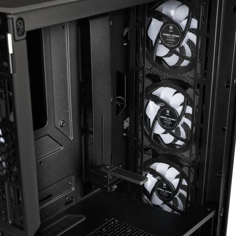 - Ventiladores Incluidos: 4 ventiladores Kolink Umbra aRGB/PWM de 120 mm Montados en los paneles frontal y trasero