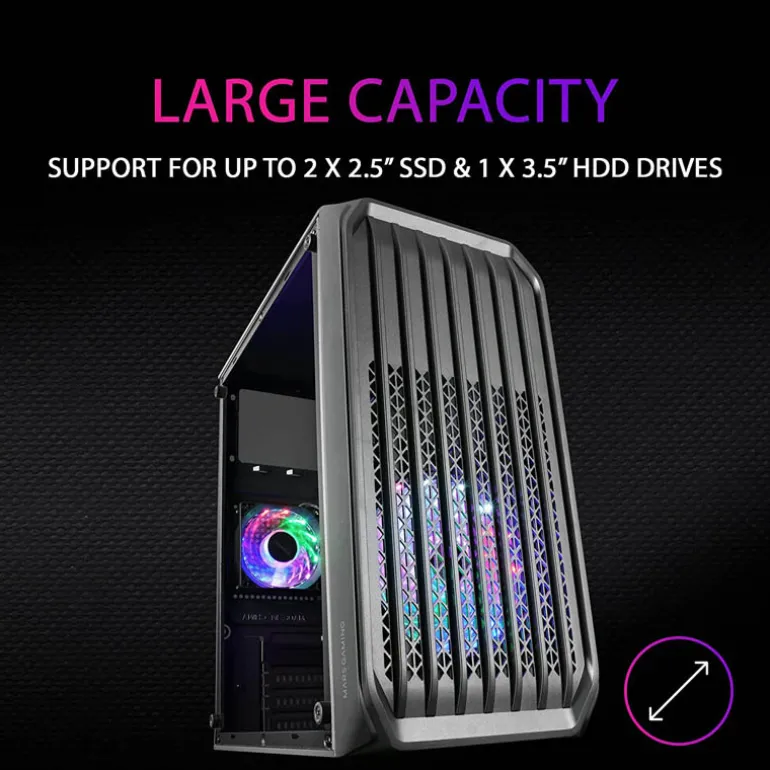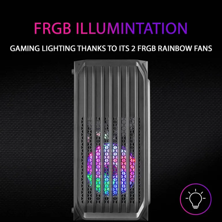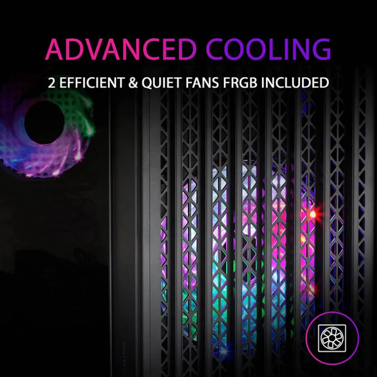 Caja compacta gaming con una refrigeración sobresaliente gracias a sus 2 ventiladores FRGB, su panel frontal con diseño de rejilla y soporte para refrigeraciones líquidas hasta 240mm*
