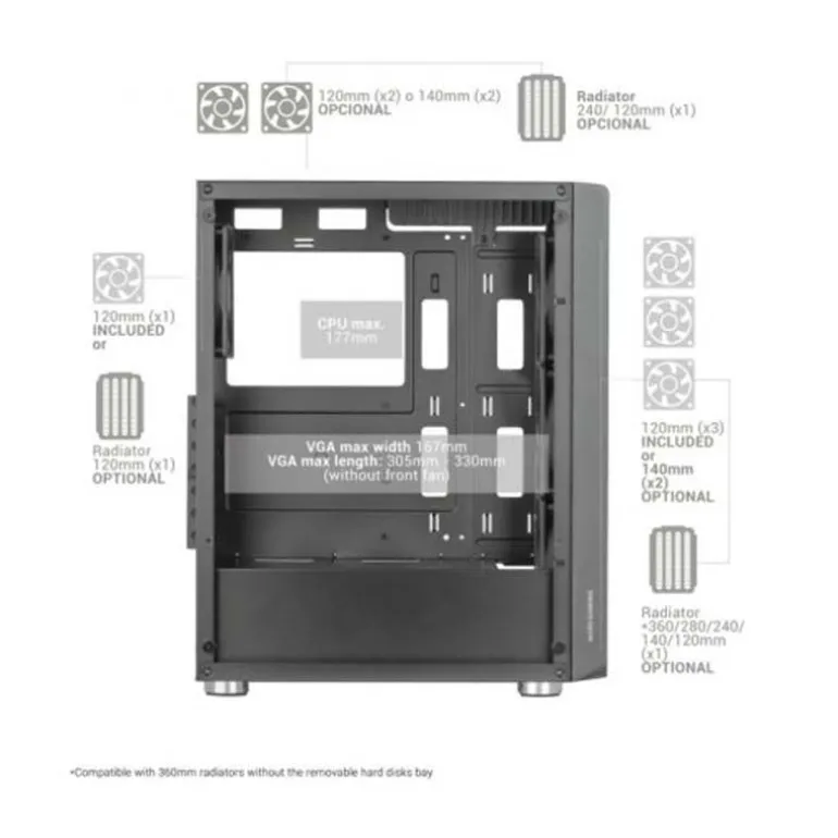 - Tamaños compatibles con el radiador trasero: 120 mm