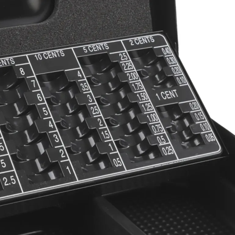 La bandeja extraíble incorpora 3 compartimentos para billetes y 8 para monedas, agilizando el cobro y el recuento. El diseño interior favorece una visión clara y un acceso rápido a cada denominación.
