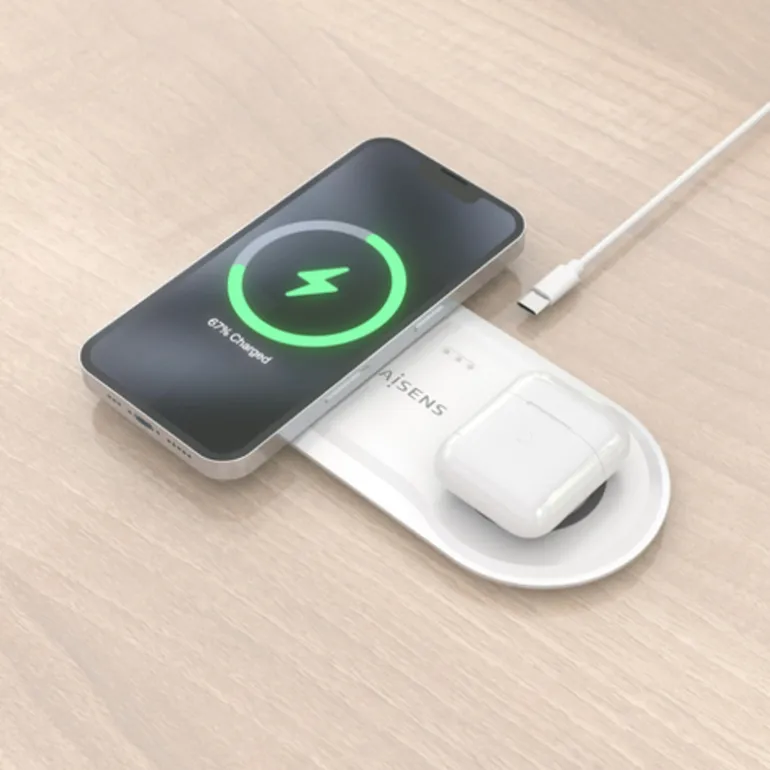 Maximiza tu eficiencia con carga inalámbrica simultánea para móvil y auriculares gracias a este cargador 2 en 1 USB-C de 15W, ideal para entornos profesionales y usuarios que buscan rendimiento, seguridad y un escritorio despejado.