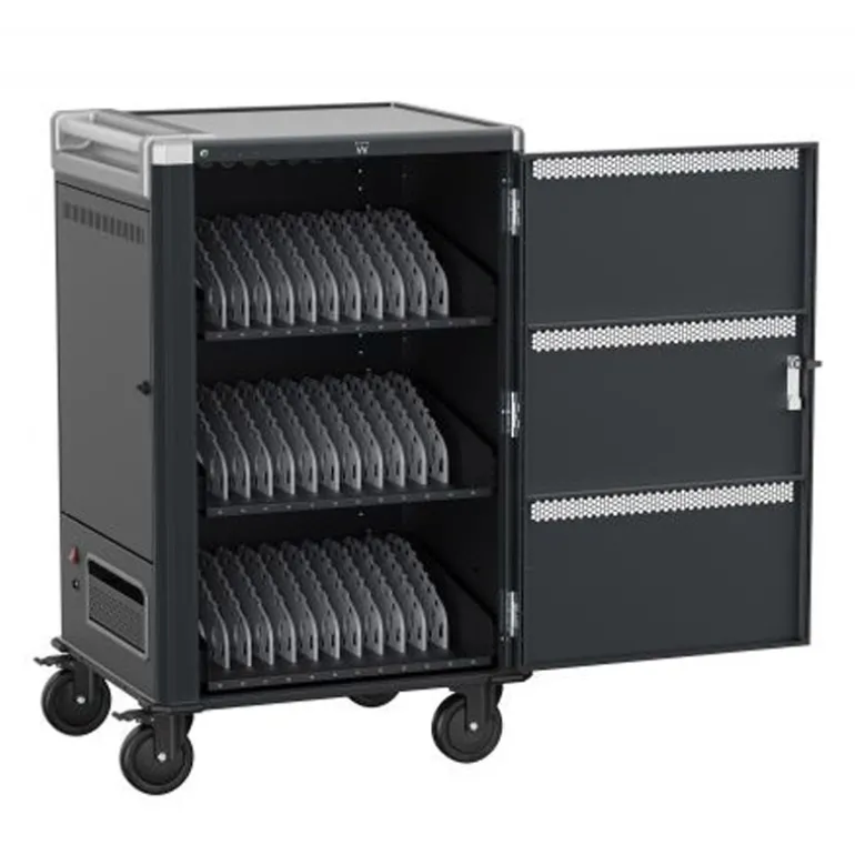 El carro de carga EW1701 le permite proteger, almacenar y cargar fácilmente hasta 36 dispositivos Tablets, Chromebook o portátiles con pantallas de hasta 15.6″. Cuenta con un sistema de carga inteligente, estantes con ranuras para dispositivos flexibles y duraderas, un sistema de administración de cables/fuente de alimentación y, lo mejor de todo, está completamente ensamblado para una implementación rápida. Además, cuenta con espacios numerados para dispositivos y sus correspondientes espacios para suministro de energía para optimizar la organización. El carro también cuenta con puertas ventiladas con un mecanismo de bloqueo con llave de 3 puntos y la opción de agregar su propio candado para mayor seguridad.
