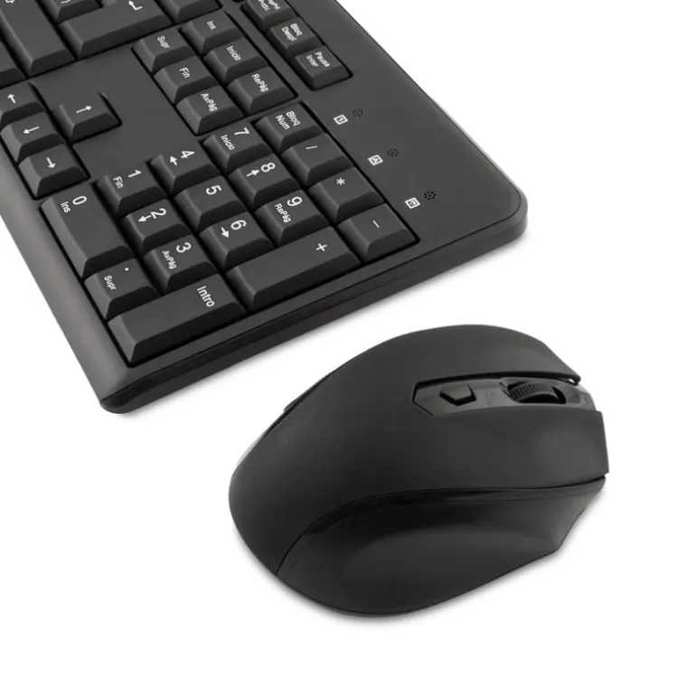 Kit completo de teclado y ratón wireless con todo lo necesario para un cómodo uso ofimático. La alimentación requiere de 2 pilas AAA para el teclado (no incluidas) y 1 pila AA para el ratón (no incluida).