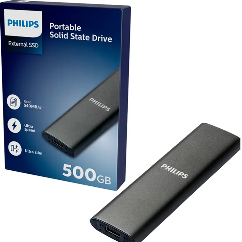 El SSD externo portátil Philips FM50SS031P de 500GB ofrece una solución de almacenamiento ultrarrápida y fiable, ideal para profesionales y usuarios exigentes. Su diseño compacto en aluminio gris espacial combina elegancia y durabilidad. Perfecto para transferencias de gran volumen, como vídeos 4K o copias de seguridad críticas.