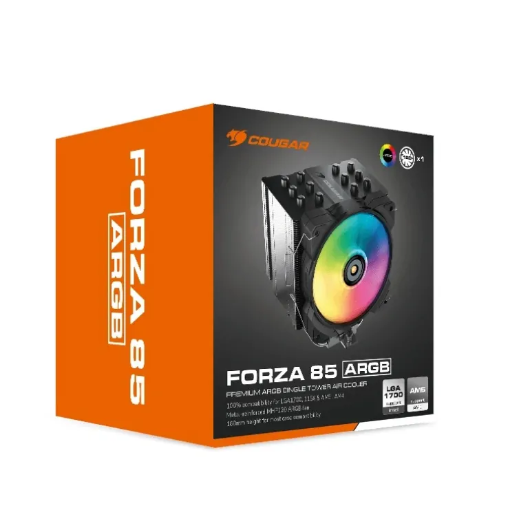Como refrigerador de aire de torre única para CPU de nivel medio/alto, Forza 85 con su cubierta frontal de diseño único, emparejado con el ventilador de alto rendimiento COUGAR MHP120, proporciona a los usuarios un equilibrio óptimo entre el funcionamiento ultra-silencioso y la refrigeración extrema. Forza 85 está absolutamente construido para la mayoría de los usuarios de rendimiento. (con capacidad de overclocking menor)