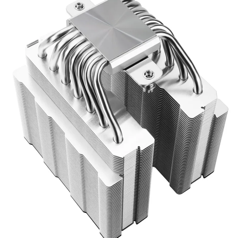 La base de cobre C1100 niquelado maximiza la transferencia de calor desde el IHS, mientras que los 7 tubos de calor de 6 mm distribuyen la energía térmica por todo el disipador. El resultado es una evacuación rápida y estable bajo cargas sostenidas.