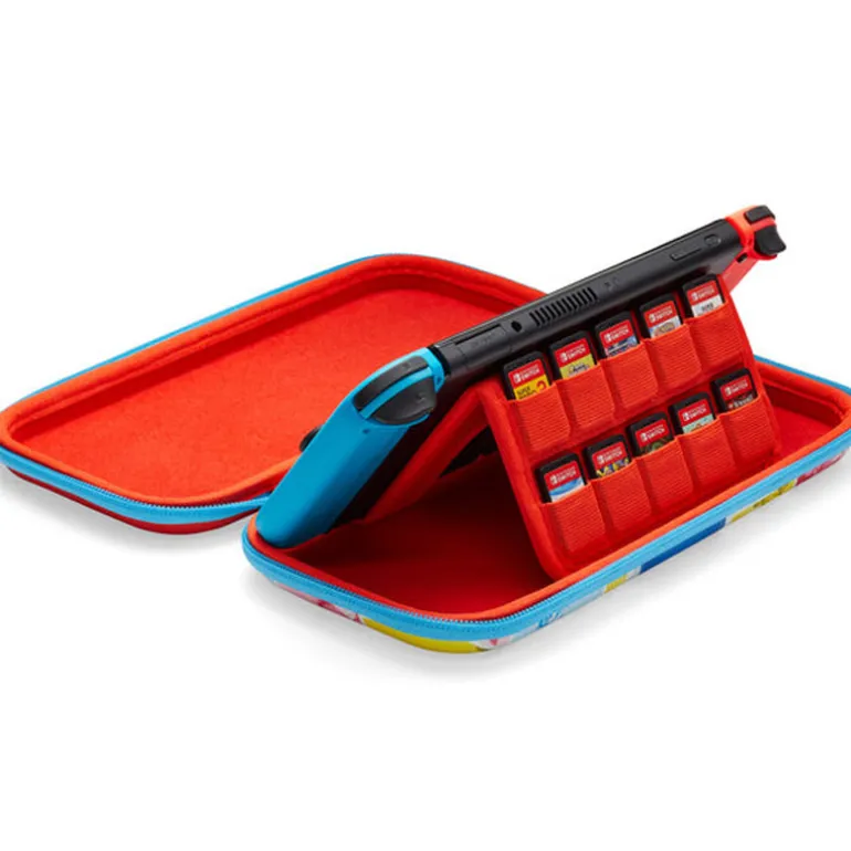Llévate tu Nintendo Switch – Modelo OLED, Nintendo Switch o Switch Lite para combinar con esta delgada funda protectora. En el interior, encontrará un forro de fieltro y un soporte de juego incorporado con almacenamiento para diez tarjetas de juego, además de un pequeño bolsillo de malla. Este estuche portátil te da la libertad de divertirte mientras viajas con tu Nintendo Switch. Donde quiera. Cuando quiera.