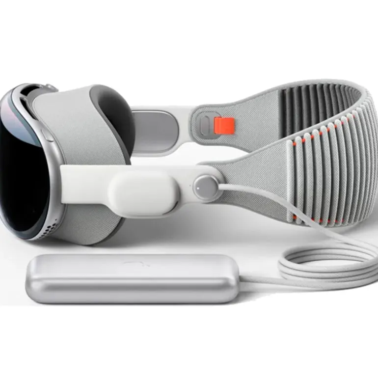 Apple Vision Pro funciona con una batería externa con carcasa de aluminio que puedes llevar en el bolsillo. Ofrece hasta 2,5 horas de uso general y hasta 3 horas de reproducción de vídeo.