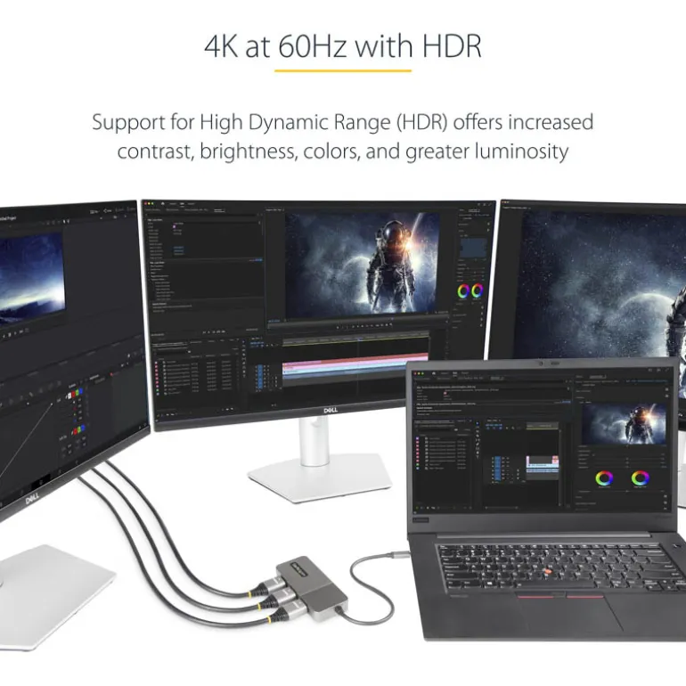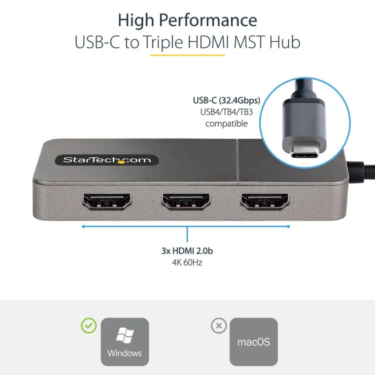 El Hub MST de USB-C a Triple HDMI maneja hasta tres pantallas 4K 60Hz, desde un host USB-C DP 1.4 con DSC – Soporta HDR y Audio HDMI de 2 canales – HDCP 2.2 – Retrocompatible con hosts DP 1.4 y DP 1.2 a resoluciones menores