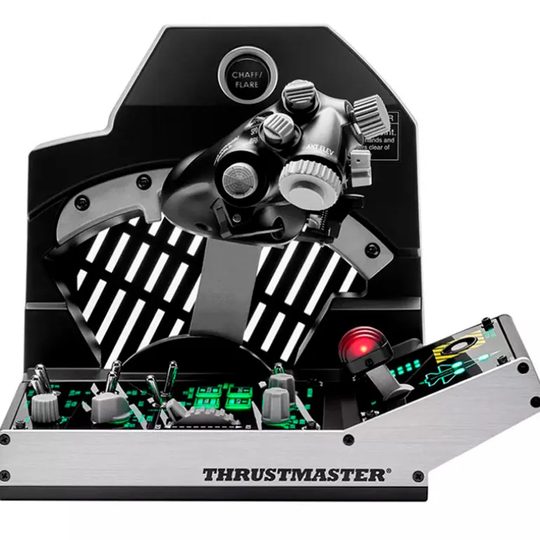 Prepárate para intensos despegues, combates y aterrizajes con 43 botones de acción metálicos (que incluyen 11 botones virtuales), una rueda de trim (eje), selectores giratorios MODE y PGRM en el panel CMDS e interruptores de mira láser y lanzamiento de armas, contramedidas y descarga rápida.