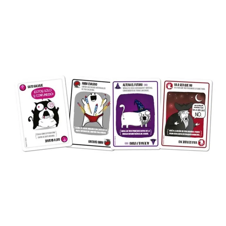 - Se trata de una versión gatuna de la ruleta rusa con un gran componente estratégico. Los jugadores van robando cartas hasta que a alguien le sale un Exploding Kitten. Cuando esto sucede, esa persona muere y queda eliminada de la partida a no ser que tenga una carta de Desactivación, que anulará el efecto del Exploding Kitten con punteros láser, rascaditas de barriga y sándwiches de atún.