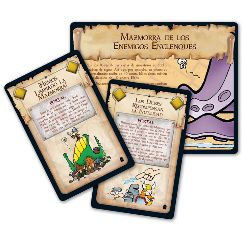 - Usa las 16 cartas de portal para saltar de una mazmorra a la siguiente en tu búsqueda de oro y gloria (y más oro). Esta caja es una expansión; necesitarás la caja básica de Munchkin para poder jugar.