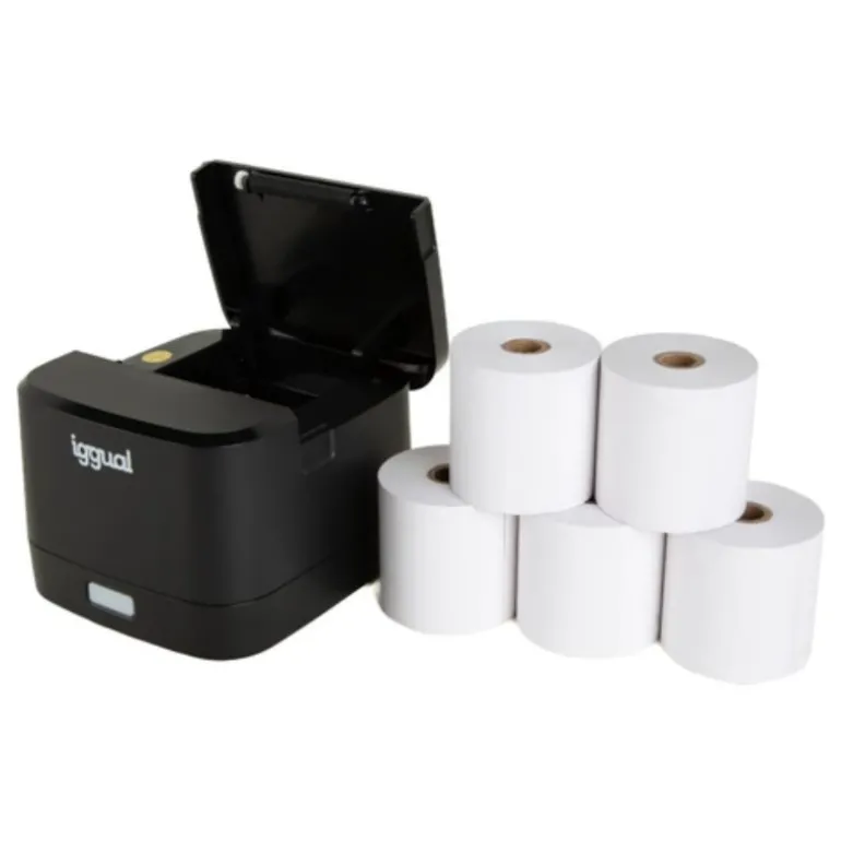 Pack listo para usar en tu punto de venta: impresora térmica iggual TP EASY 58 con 5 rollos de papel térmico libre de BPA. Compacta, fiable y económica, imprime tickets de 58 mm con 90 mm/s y 203 × 203 dpi, compatible con Windows, Linux, Android e iOS. Conexión USB y RJ11 para apertura automática de cajón.