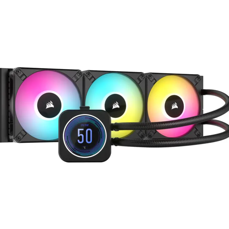 - Refrigerador líquido para CPU con pantalla CORSAIR iCUE H150i ELITE LCD, negro