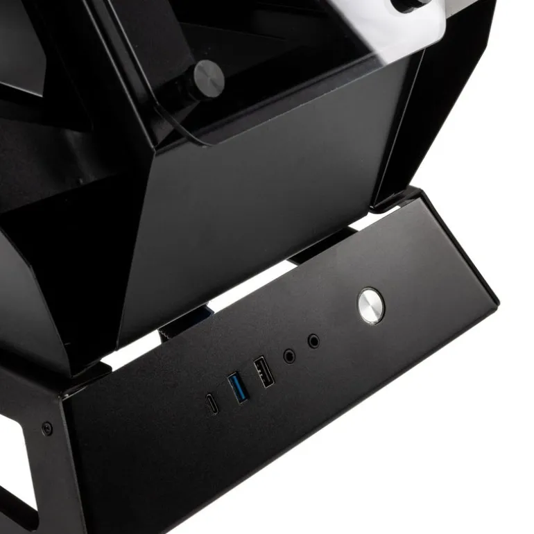 La caja angular se asienta ligeramente en ángulo hacia arriba sobre una base distintiva, que también está hecha de aluminio anodizado negro. El panel de E / S ofrece una excelente conectividad, con un moderno puerto USB 3.1 Tipo C, así como un puerto USB 3.1 y un puerto USB 2.0. Con esta variedad de conexiones, casi todos los periféricos USB se pueden usar directamente en la carcasa, ya sea teclado y mouse, soportes de datos USB externos o incluso teléfonos inteligentes, que incluso se pueden cargar allí.