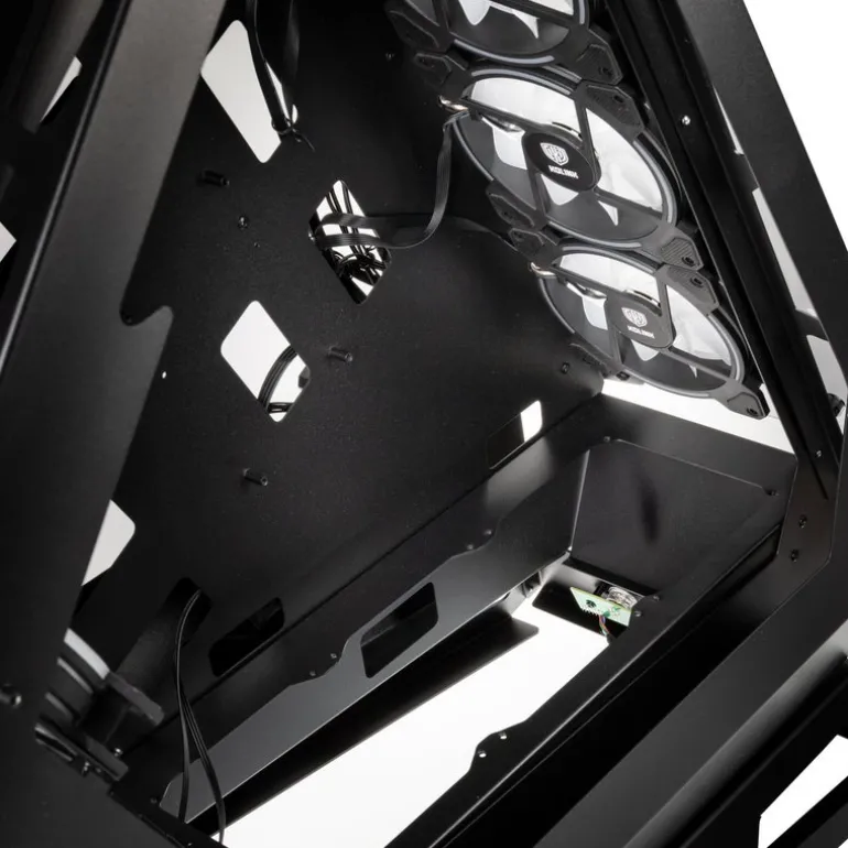 Cinco ventiladores PWM de 120 mm con LED RGB de doble anillo direccionables digitalmente ya están preinstalados. Cuatro de ellos adornan el frente y se pueden admirar a través del vidrio templado tintado. Otro ventilador PWM de 120 mm, también con LED RGB direccionables digitalmente, está integrado en la única ranura del ventilador en la parte trasera. Se pueden instalar dos ventiladores adicionales de 120 mm debajo de la tapa y tres ventiladores de 120 mm en la parte inferior. En consecuencia, los ventiladores también pueden ser reemplazados por radiadores. Se pueden montar radiadores de 360 â鈧€ón ATX (disponible por separado) está montada debajo de las tres ranuras del ventilador en la base y está oculta por la base. Puede tener hasta 220 milímetros de longitud.