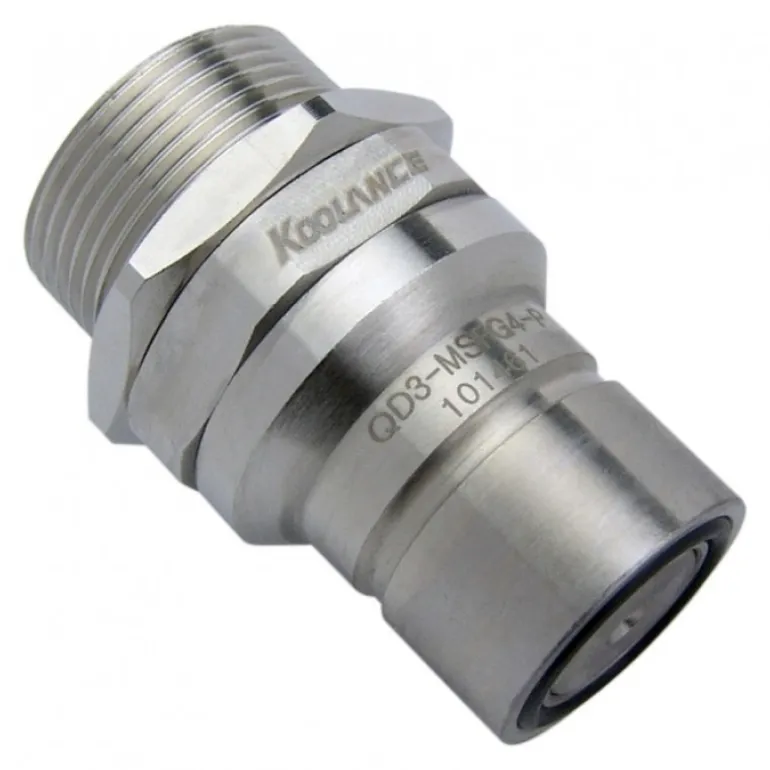 Acoplamiento sin derrame patentado por Koolance de desconexión rápida con apagado automático. G 1/4 Rosca BSPP (paralela) hembra con montaje en panel frente a una desconexión rápida «QD3» macho. Solo se ajustará a una desconexión rápida Koolance QD3 hembra.