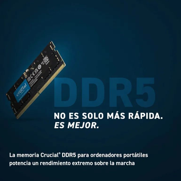 Las memorias Crucial DDR5 para ordenadores portátiles pueden potenciar su ordenador para alcanzar transferencias de datos un 50 % superiores en su lanzamiento que la DDR4, proporcionando transferencia de archivos, descargas, tasas de actualización y tiempos de carga más rápidos, además de retardos mucho menores.