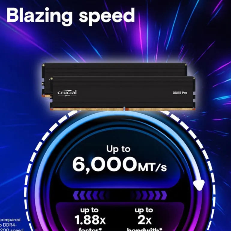 Con el doble de ancho de banda que la generación anterior, Crucial DDR5 Pro permite multitarea de siguiente nivel y procesamiento más rápido, para que puedas afrontar incluso cargas de trabajo pesadas en menos tiempo.
