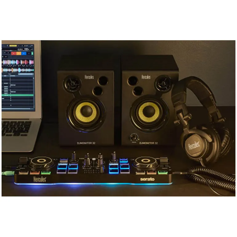 El Hercules DJStarter Kit incluye un par de altavoces de monitorización activos Hercules DJMonitor 32 para mezclar en casa. Su tamaño compacto facilita su uso sobre un escritorio en la habitación o como altavoces de monitorización de DJ en una fiesta.